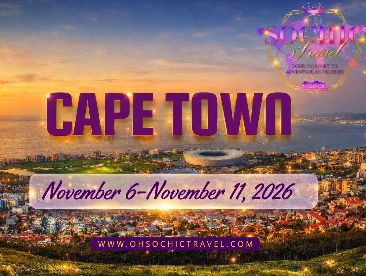Experience the magic where mountains meet the sea. Cape Town is a destination that blends breathtaking natural beauty, rich culture, world-class cuisine, and unforgettable adventure. This SoChic-curated experience invites you to explore iconic landmarks like Table Mountain, indulge in exquisite South African wines, stroll along pristine beaches, and immerse yourself in the vibrant history and spirit of the city. From scenic coastlines to stylish city streets, every moment is designed with luxury, comfort, and culture in mind. Whether you’re seeking relaxation, exploration, or connection, this journey offers the perfect balance of elegance and excitement. Cape Town isn’t just a trip — it’s a vibe, a memory, and a moment you’ll carry with you long after you return.