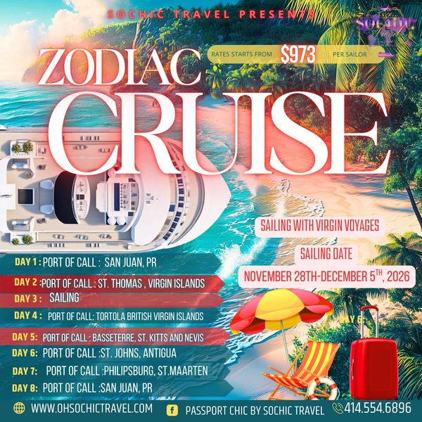 Sail in style with SoChic aboard an adults-only, luxe, high-vibe Virgin Voyages experience. Enjoy curated ports, beach days, nightlife, fine dining, wellness, and all-inclusive indulgence as we island-hop through the Caribbean. This is grown, sexy, and unapologetically fun.